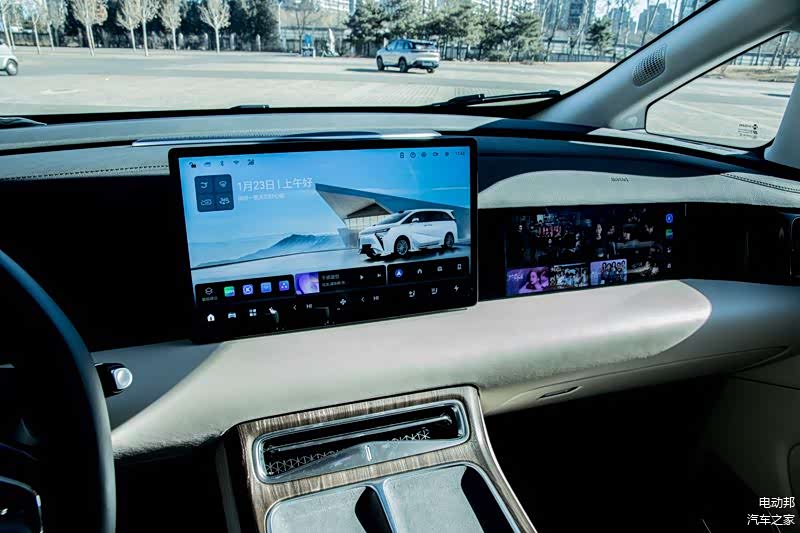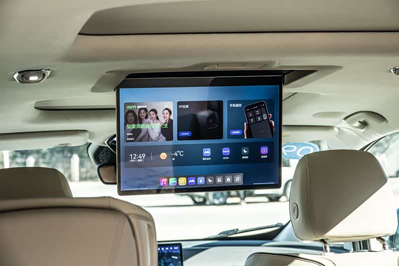 在乘客都“坐舒服”了之后,接着就可以享受全方位的智能化体验。首先当然就是14.6英寸LED高清中控触摸屏、12.3英寸LED高清副驾触摸屏以及17.3英寸多功能超大智慧吸顶屏。它们在双8155芯片的加持下,不但可以为三排乘客提供多样化的视听娱乐应用,还能实现多屏互联、四音区AI智能语音交互。