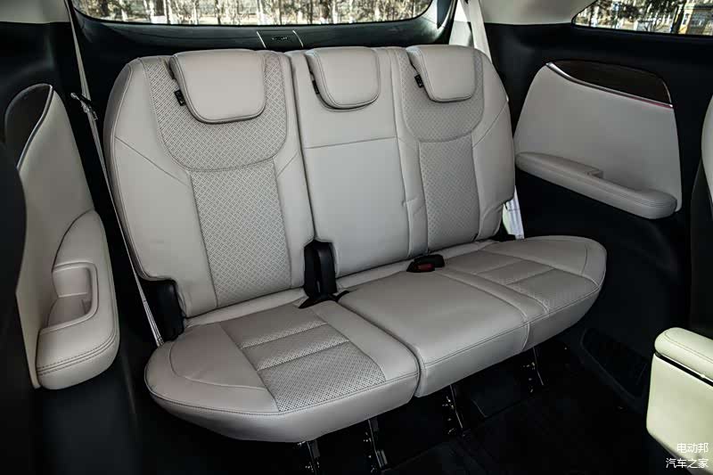 另外这两个座椅不但自身宽度适中,即便有两个大扶手,也不会让我们感到局促。而且它们之间还有个宽绰的过道,乘客从这里进入第三排也可以很从容。当不走人的时候,这里还能支起一个小桌板,放些随手的零食或纸巾等小物件,甚至还能给手机无线充电。