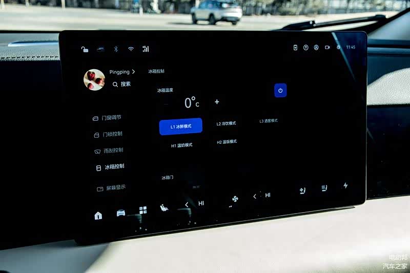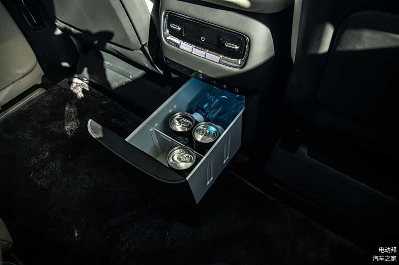 其次就是全系可以选装的「24H车载智能冷暖冰箱」,它的运行温度为0-55℃,可在此区间内自动加热或制冷。而且这款冰箱不仅能够在箱体上设置温度、模式,还可以从中控屏上进行互联操作,非常方便。