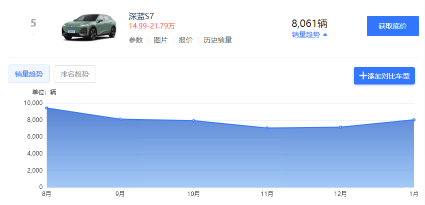 深蓝S7上市后销量一直不错,上市5个月累计销量超5万辆。并且在海外市场也销量不错。2023年,深蓝SL03和深蓝S7这两款车共销售了136912辆。2024年1月,深蓝S7的销量为8061辆,整体来看,深蓝S7在增程车销量排名中位列第五,排在问界M7、理想L7、L8、L9之后。