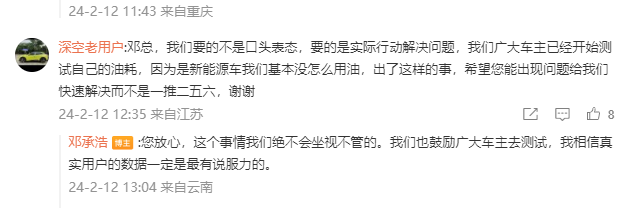 关于车主在社交平台发布的高油耗视频,深蓝汽车官方认为数据与实际不符,也有很多用户表示自己会实测自己的车。而深蓝汽车CEO邓承浩的态度也很有诚意,给用户吃了一颗定心丸。