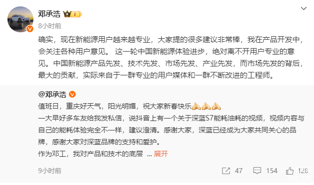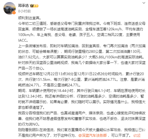 针对这位车主发布的油耗数据,深蓝汽车CEO邓承浩2月12日在其个人社交媒体上进行回应。具体信息如下: