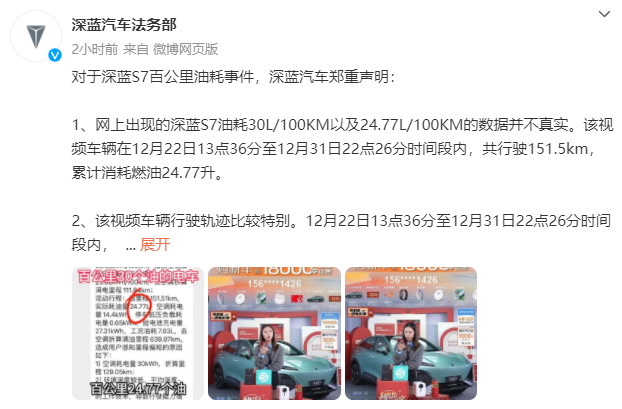今日,深蓝汽车法务部的官方微博针对对此前深蓝S7高油耗事件进行了官方回应。详细内容如下:
