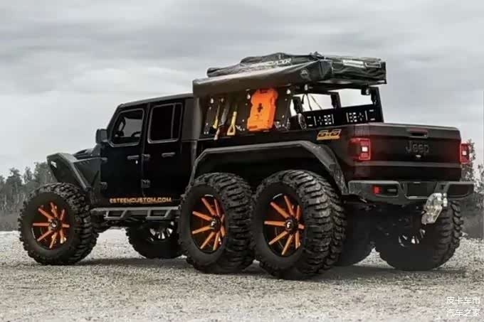 该车型以GT角斗士皮卡为基础改装而来,采用前二后四轮毂设计,整体造型与普通四轮版无太大差别。车内配有圆筒式仪表、悬浮式中控屏、飞机式档把,采用大量Jeep原厂设计。吉普角斗士6*6提供2.0T涡轮四缸、3.6L V6、3.6T柴油涡轮V6三种动力,最大功率分别为270Ps、285Ps以及375Ps,其中柴油车型的最大扭矩可达637N·m。