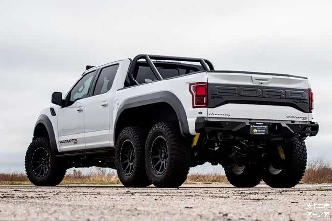 轩尼诗迅猛龙6X6整车相较标准版的福特猛禽搭载了升级的Fox定制Racing SHOWS减震器、20英寸轮毂、37英寸越野轮胎,以及特殊的前后保险杠来增加通过性,由于6X6版本的重量大幅增加,因此车辆每侧加装了一个承重板簧,可让车辆装载更重的货物。