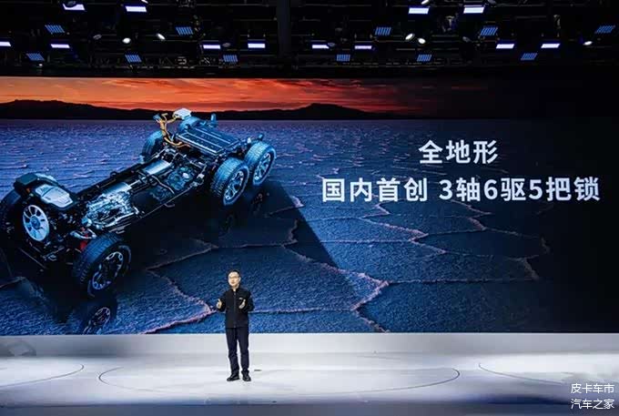 2023年4月,长城首个6X6超级越野平台全球首发,据网传售价近百万。该车搭载可以实现极端狂野的”3轴6驱”布局,标配5把电控差速锁、氮气减震器,并采用非承载高扭转刚度车架,匹配前双叉臂独立悬架+中后五连杆整体桥悬架,33寸超大越野轮胎,成就全场景、全地形超级越野能力。