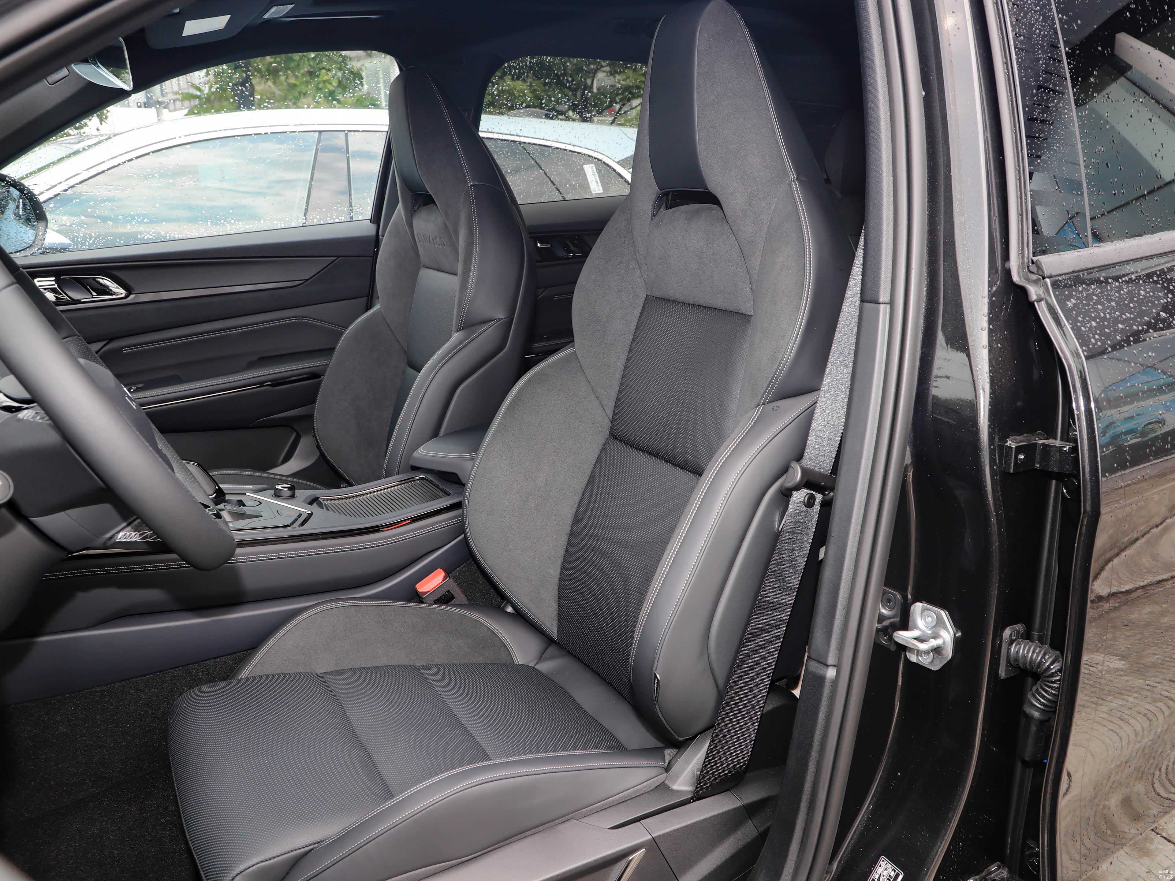 在空间布局方面,座椅采用皮/翻毛皮材质,采用Nubuck真皮皮质风格,并采用运动风格座椅,整体设计极具质感。我身为身高1.76米,体重78公斤的男性,在调整好驾驶位置后,前排头部空间剩余约1拳2指,座椅的包裹性和支撑性表现优秀,特别是对于腰/肩部的支撑;保持前排座椅不变,坐在后排,头部空间仍有约1拳2指,膝盖离地高度达到约2拳的空间,同时车顶配备可开启全景天窗,综合表现相当出色。然而,后排中央座椅的舒适度稍显不足,不适合长途乘坐,但提供了头枕,中央地板的隆起高度控制在可接受范围内,这能保证乘客的脚部舒适性。