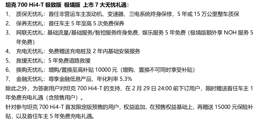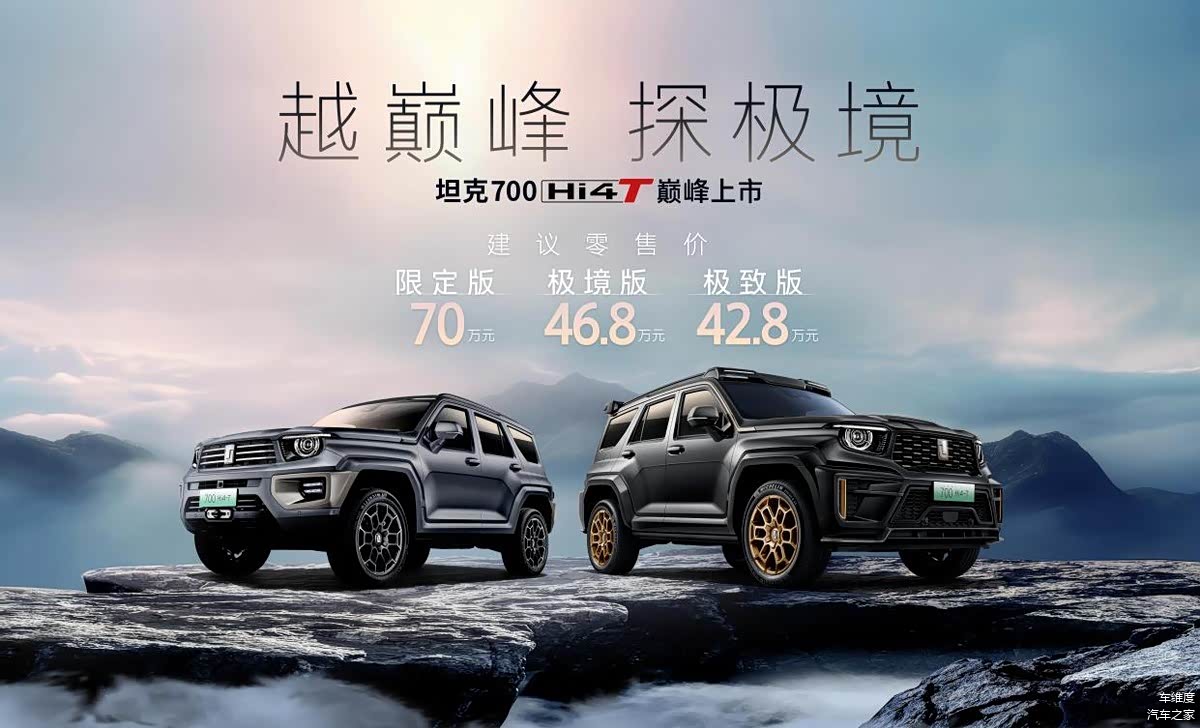 越巅峰,探极境,中国豪华越野旗舰坦克700 Hi4-T于2月26日巅峰上市,坦克700 Hi4-T限定版建议零售价70万元,极境版建议零售价46.8万元,极致版建议零售价42.8万元。以巅峰技术成就极致体验,以极致探索承载无限热爱,坦克700 Hi4-T打造全球豪华越野新标杆。