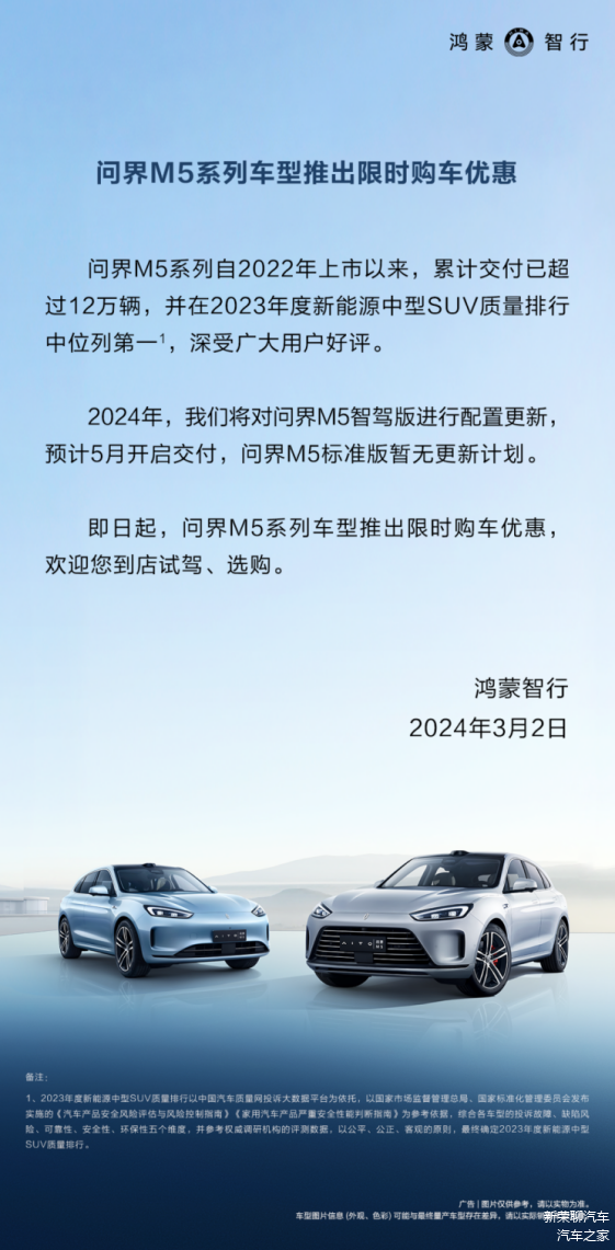据官方信息透露,问界M5标准版暂无更新计划,但同样享有此次购车的优惠权益,因此,现在正是入手的最佳时机。而对于问界M5智驾版,将会迎来配置的更新,并计划在5月份开始交付。问界M5系列一直以其用料扎实和高品质在用户中获得广泛好评,新版本也必然会继续保持这一高水平,预计在推出后一段时间内不会降价。对于那些短期内需要提车和重视性价比的消费者来说,选择当前版本的问界M5无疑是最佳选择,即买即提,全面享受流畅的智能驾驶和畅快淋漓的操控体验。