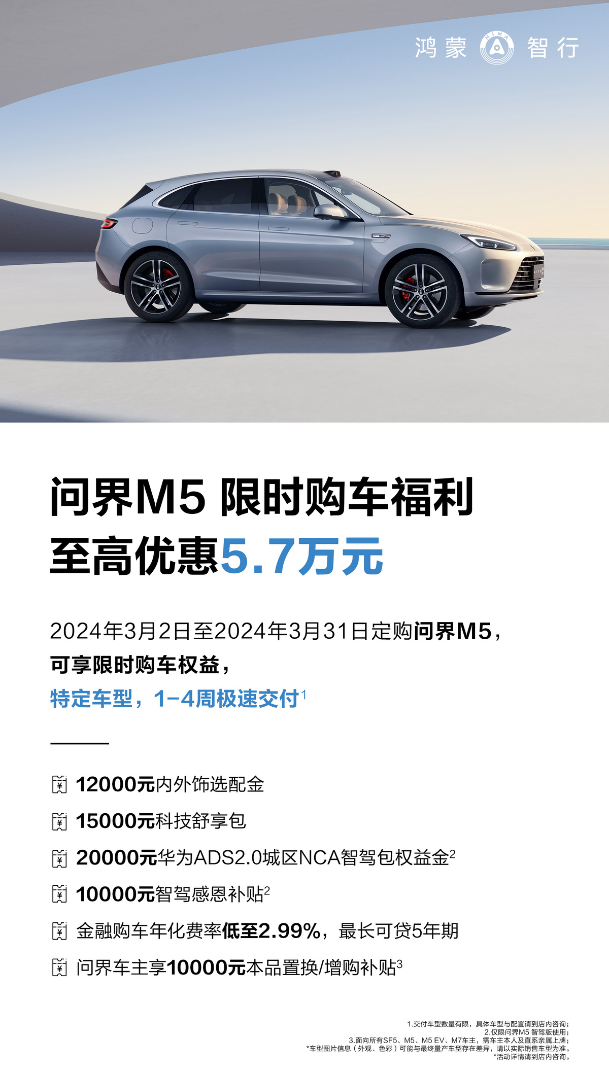 最后,要为大家带来本次的限时购车优惠详情。从即刻起至2024年3月31日止,下单预订的消费者最快两周就能提车,并且可以享受至高57000元的购车权益。购买问界M5的消费者将获得一份价值15000元的科技舒享包以及12000元的内外饰任选金。如果选择的是智驾版,还将额外收到价值20000元的华为ADS智驾包等额抵扣券和10000元的智驾补贴。
