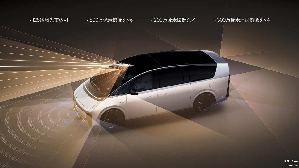 驾驶辅助:2颗英伟达Orin-X芯片,508TOPS算力,1颗禾赛的128线激光雷达,1颗毫米波雷达,12颗超声波雷达,算法则是理想自己的AD MAX,支持城区+高速领航、远程召唤、遥控泊车等功能。