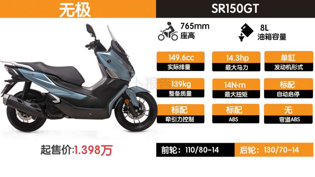 无极SR150GT则是更符合年轻人的胃口,同时较低的售价也减轻了购车压力。