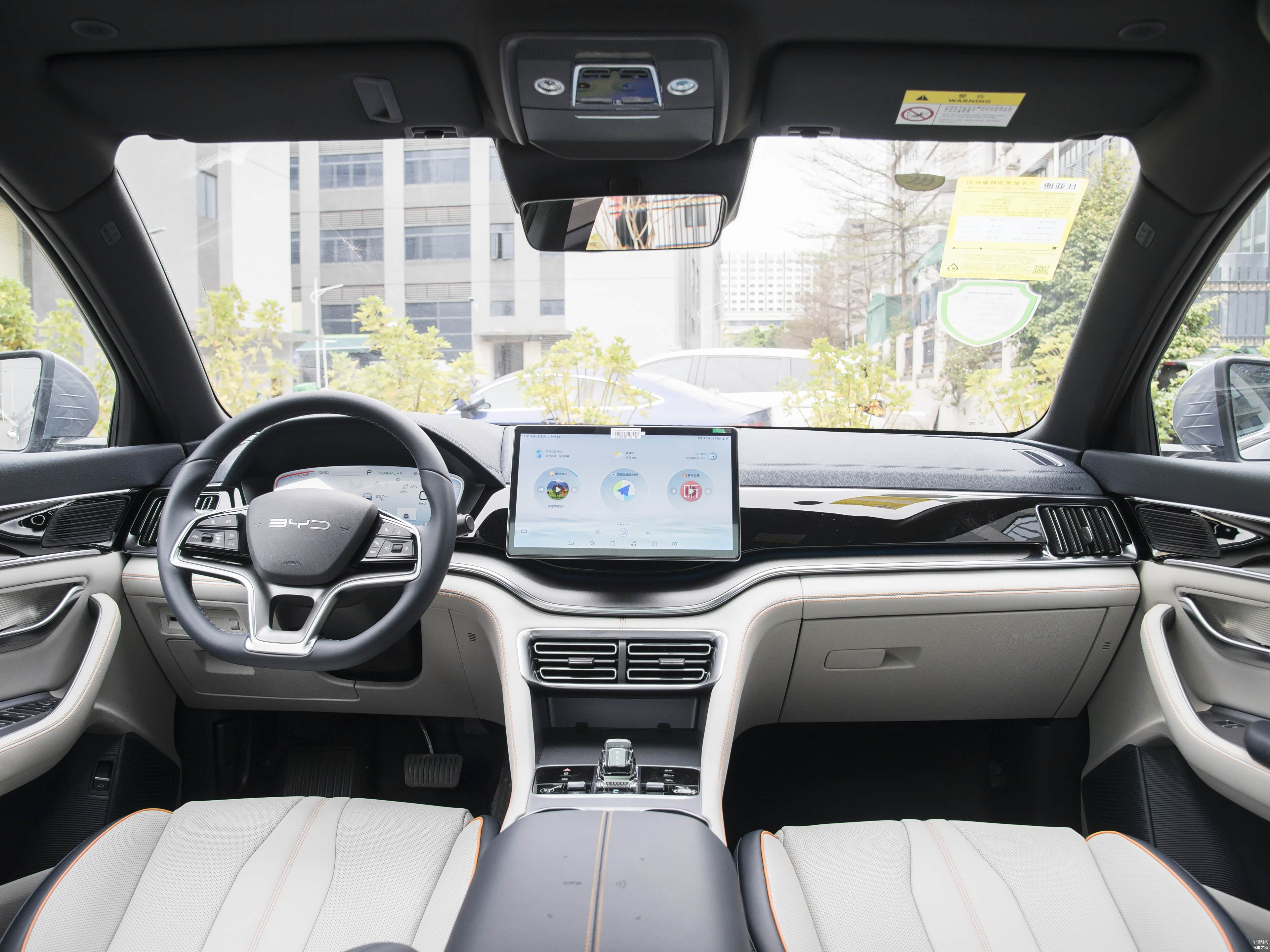 内饰方面,宋PLUS DM-i遵循简约家居风格,采用皮革包裹的三辐式多功能方向盘,手感饱满、易于操控,且支持上下、前后调节。配备了12.3英寸全液晶仪表盘,显示丰富多彩的驾驶信息;中控台呈现环抱式设计,采用多种材质进行拼接,12.8英寸悬浮式多媒体显示屏支持触摸和旋转操作,具备OTA在线升级、车机互联和智能手机互联等实用功能。前排配置了无线充电设备,大量实体按键被简化,整体设计简洁美观。