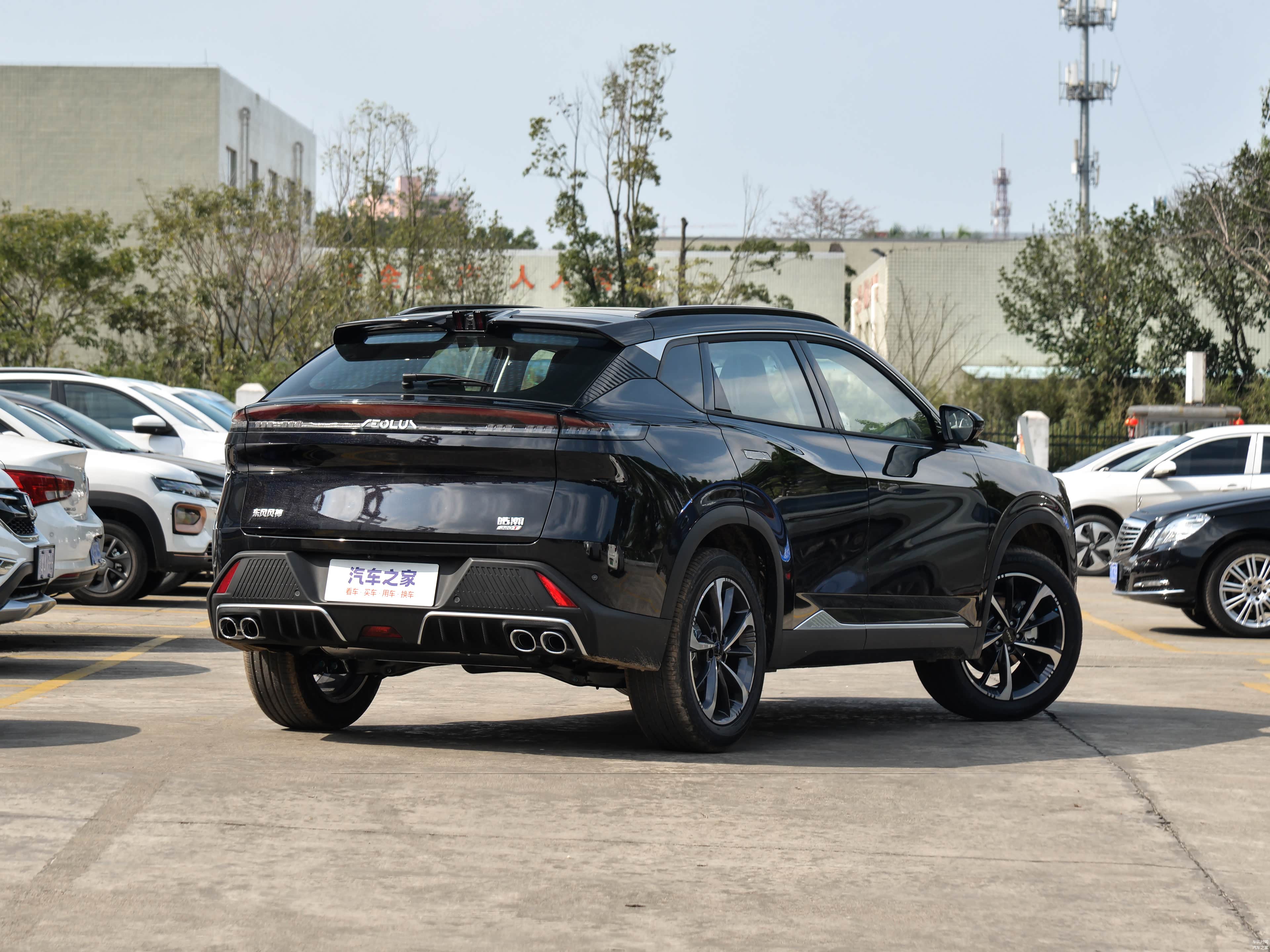 侧面采用全黑色调设计,后部带有一定的溜背元素,两条上扬的腰线自C柱起向上延伸,搭配20英寸五角星形状的轮毂,营造出强烈的运动氛围。车尾区域,镂空的扰流板与高位刹车灯相结合,造型独特;下方的贯穿式尾灯在点亮后视觉效果十分均匀。