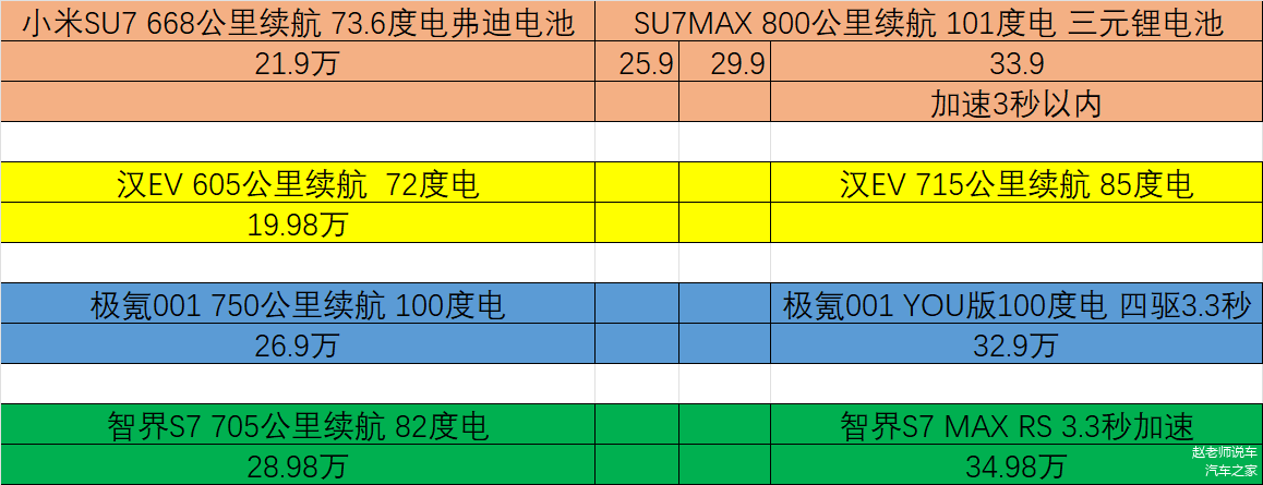 而小米SU7顶配的定价可以参考极氪001YOU版32.9万和智界S7的34.98万,智界的定价偏高,所以小米SU7的顶配很有可能是33.9万,至于中配的价格一个24.9/25.9万,一个29.9万,可以保存视频,上市后看我说的对不对,关于小米SU7我最怕的就是他上市后其他对手要来一个官降,雷总该如何应对呢?