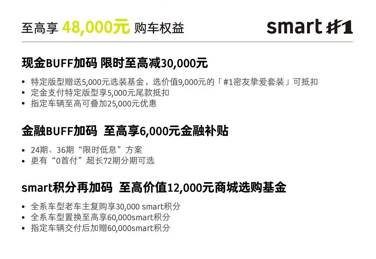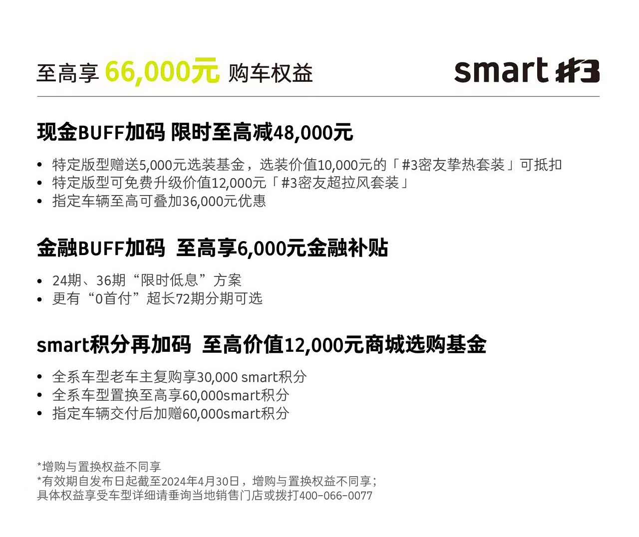 值得一提的是,3月1日至4月30日期间,下定smart精灵#1至高可享权益 48,000 元,下定smart精灵#3可至高享权益 66,000 元,还有超多丰厚购车权益等你来领。距离开启更smart的新奢都市生活,只差一辆smart精灵!