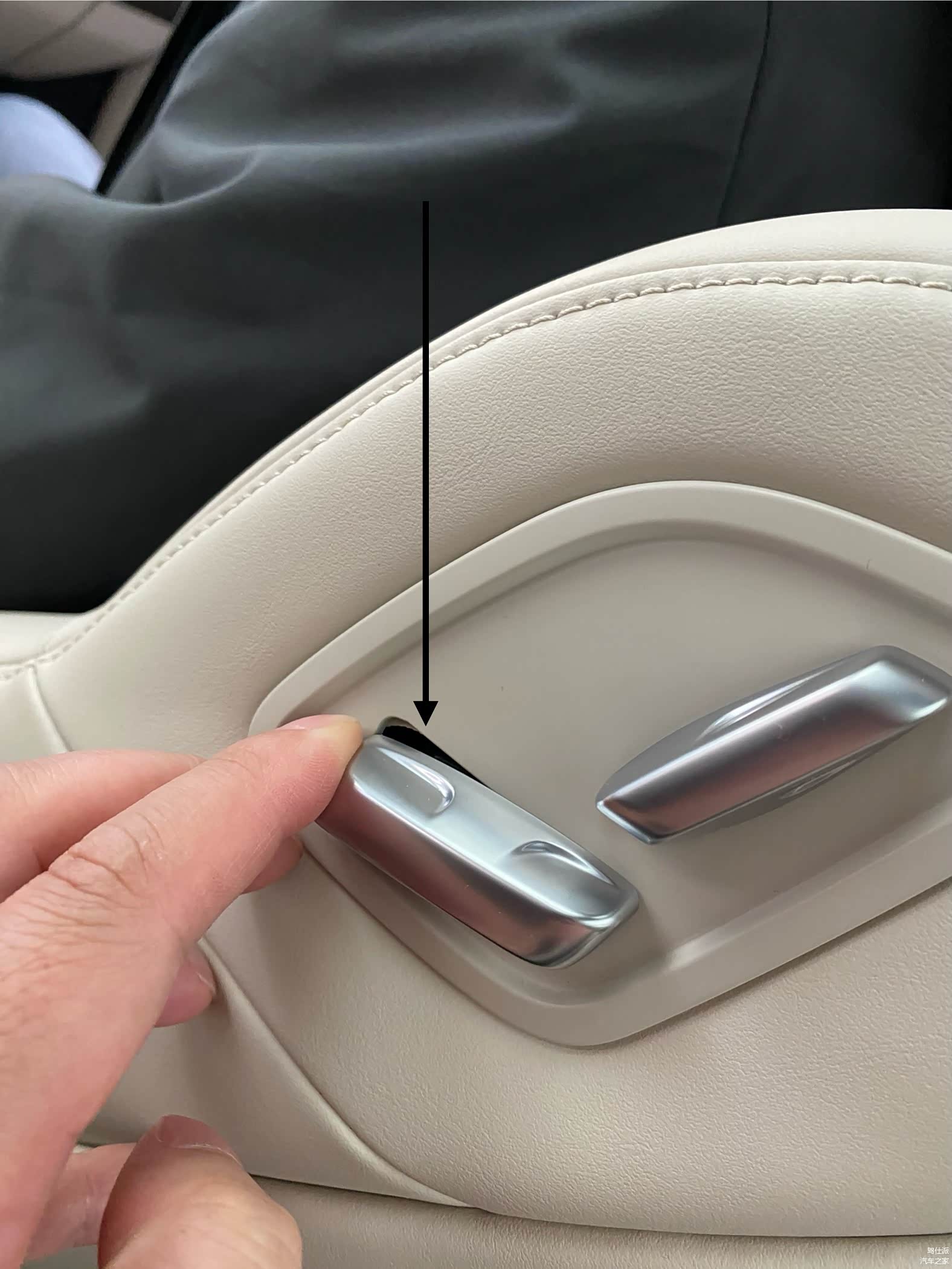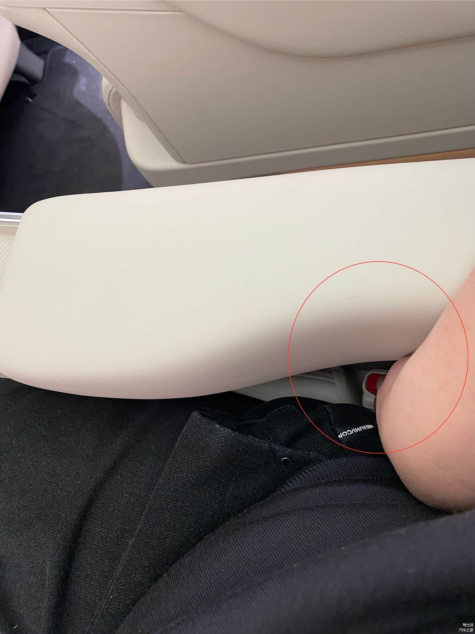 还是中排独立座椅,因为全封闭式结构的原因,扶手前面又设置了一个手机无线充电面板,导致扶手前面Y向凸起,往buckle里面插带扣非常不方便,稍微胖一点的手只能这样别着过去。