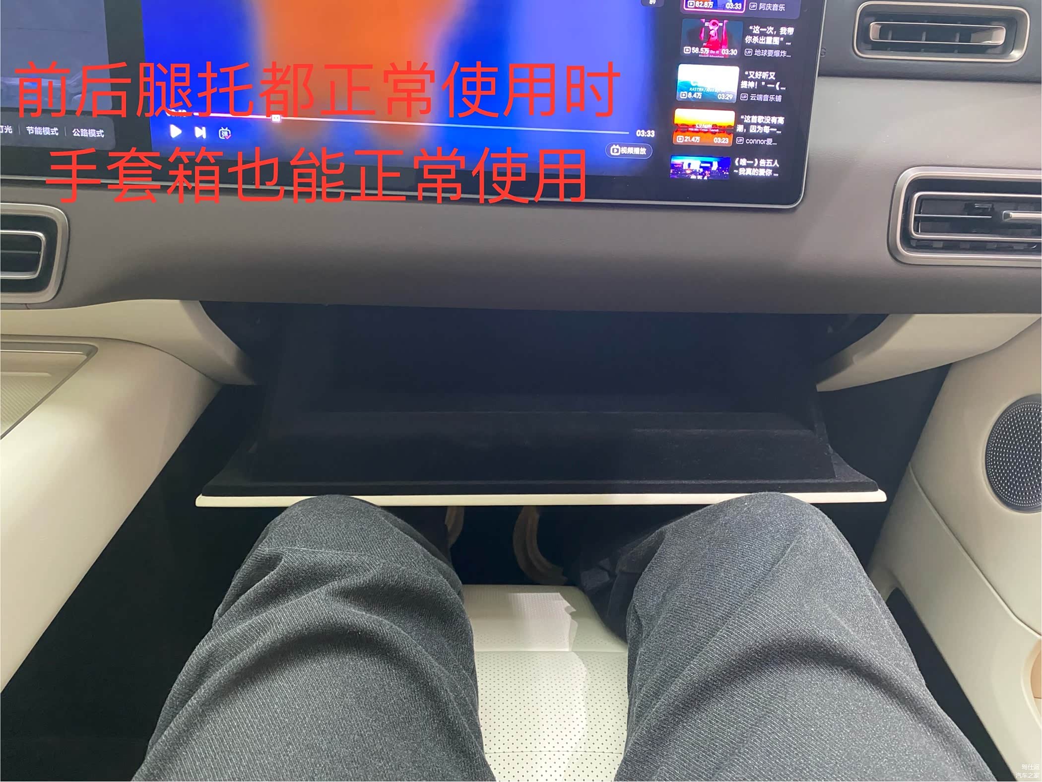 当MEGA在二排座椅大角度躺倒使用腿托时(MEGA躺倒因为不能横滑,为了保证二排靠背不与后轮毂包干涉,这时二排座椅会自动往前移,腿托为了不与前排靠背干涉,前排也需要往前移动合适距离),前排同时打开腿托,你会发现手套箱还能打开一个大角度正常取物。