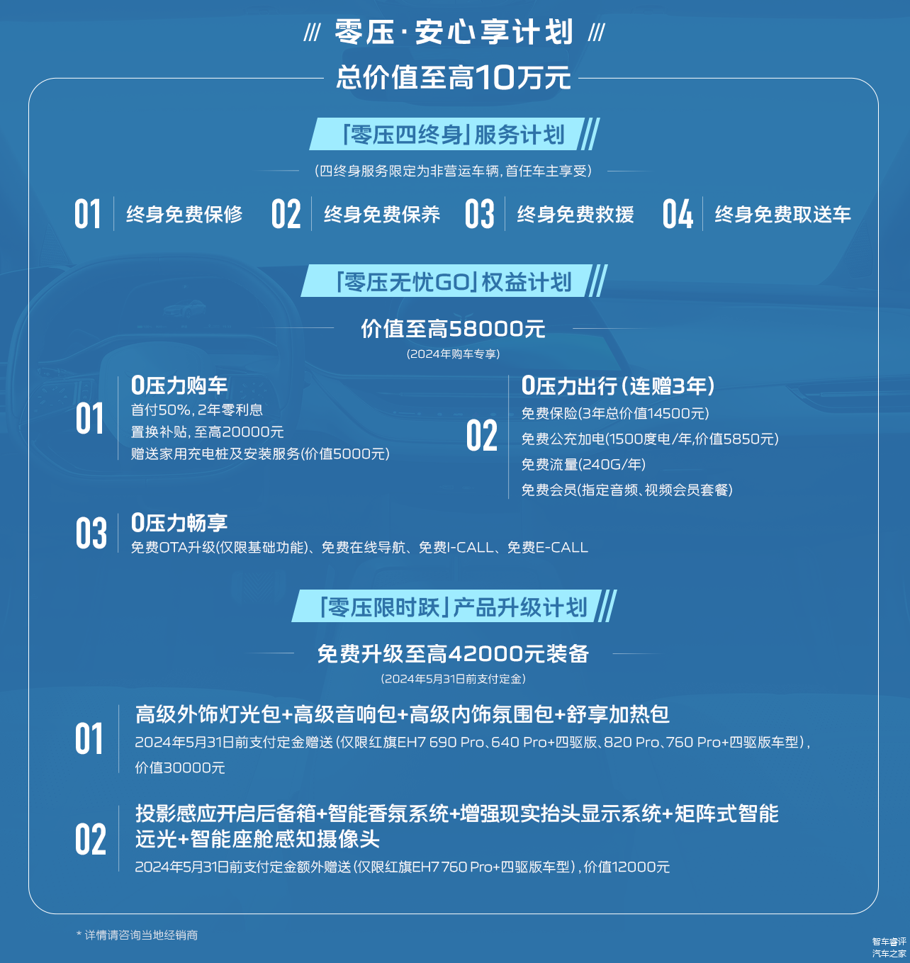 相关的购车权益包括了4项终生服务计划,最高价值58000元的购车权益,以及限时的产品升级计划。详情见下图: