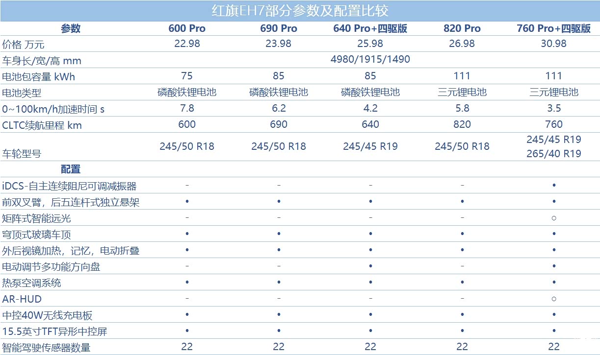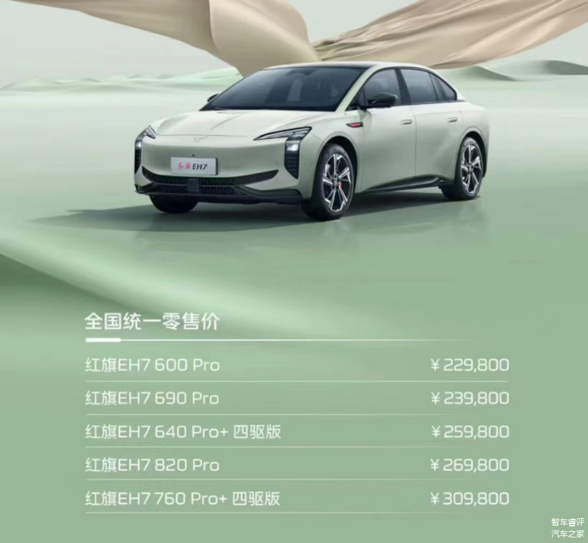 红旗EH7定位五门五座纯电动中大型轿车,共推出5款车型,包括两驱和四驱两种动力形式。全国统一零售价22.98万元起,至高享10万元权益。其中,入门的600 Pro售价22.98万元,顶配的760 Pro+四驱版售价达到了30.98万元。具体售价见下图: