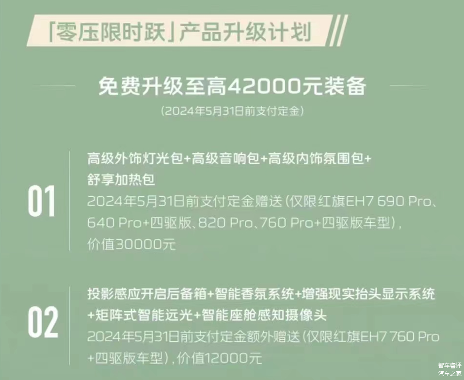 2024年5月31日前购买红旗EH7,可以有一个配置升级的优惠。其中01号选装包适用于除了入门版的4款车型,价值30000元,纯属“白给”,非常划算。