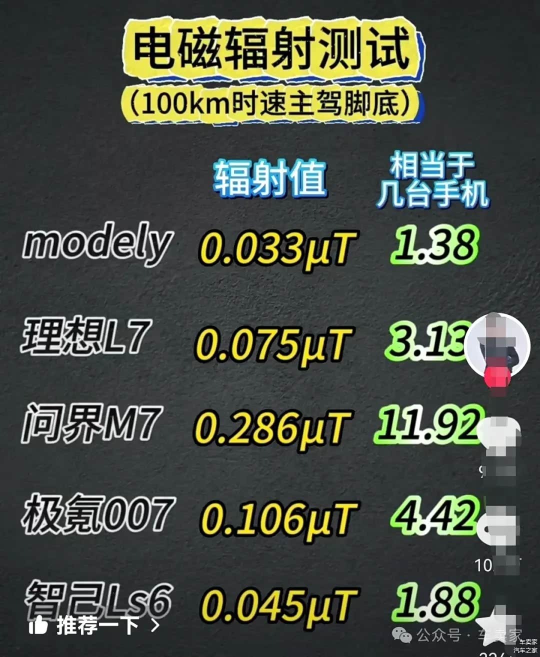 来看看这位大V测试出来的结果,首先所有测试的这些车型都是符合国家标准的,所以说不存在不合格这一说,就是看几辆车之间的差异了!从测试结果来看问界M7的电磁辐射是最高的,相当于11.92台手机,而特斯拉Model Y相当于1.38台手机, 智己Ls6(图片 | 参数 | 询价)相当于1.88台手机,理想L7相当于3.13台手机,极氪007相当于4.42台手机,没有对比就没有伤害,在这几台测试的车型中问界M7的辐射结果确实有点高了!当然了车卖家还是要再次重申一下,这几台车都是符合国标的!