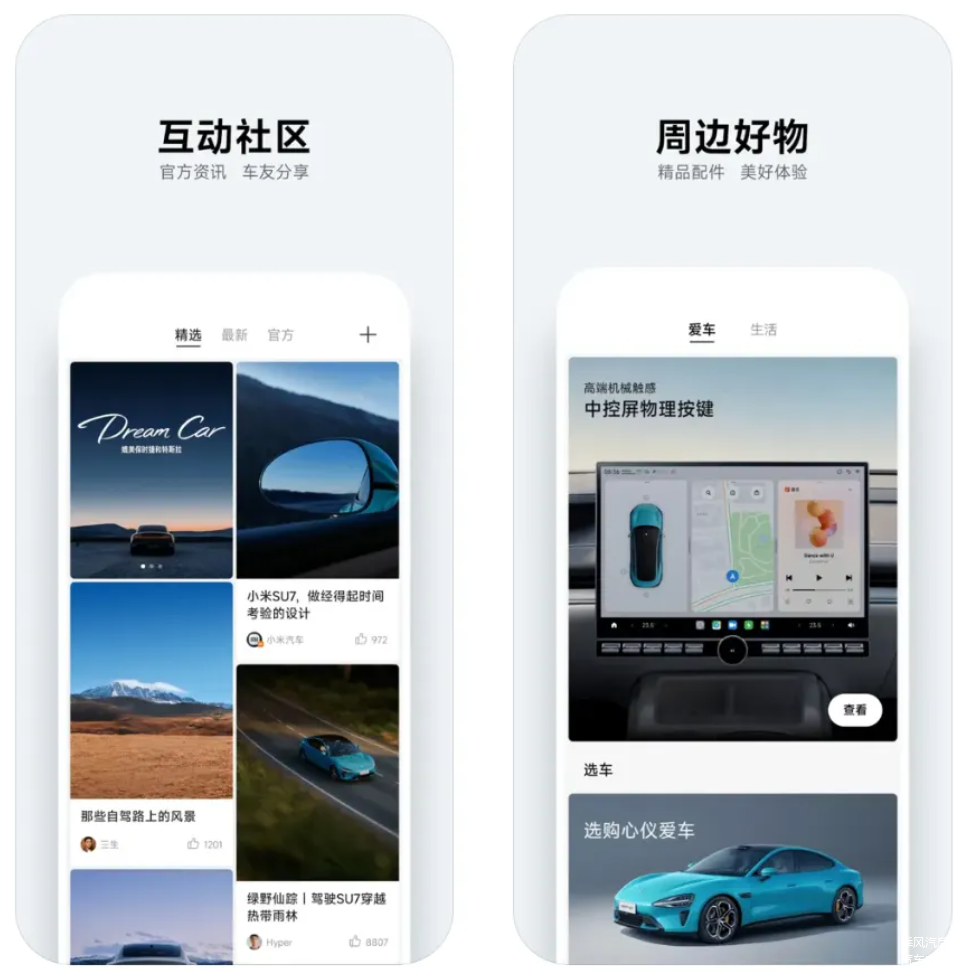 在互动社区栏目,分为精选,最新,官方,三部分消息推送。内容可以互动,可以点赞等功能。在周边好物栏目,分爱车,生活两部分,这里就是在线商城内容,可以选购小米汽车,也可以选购车周边商品等。