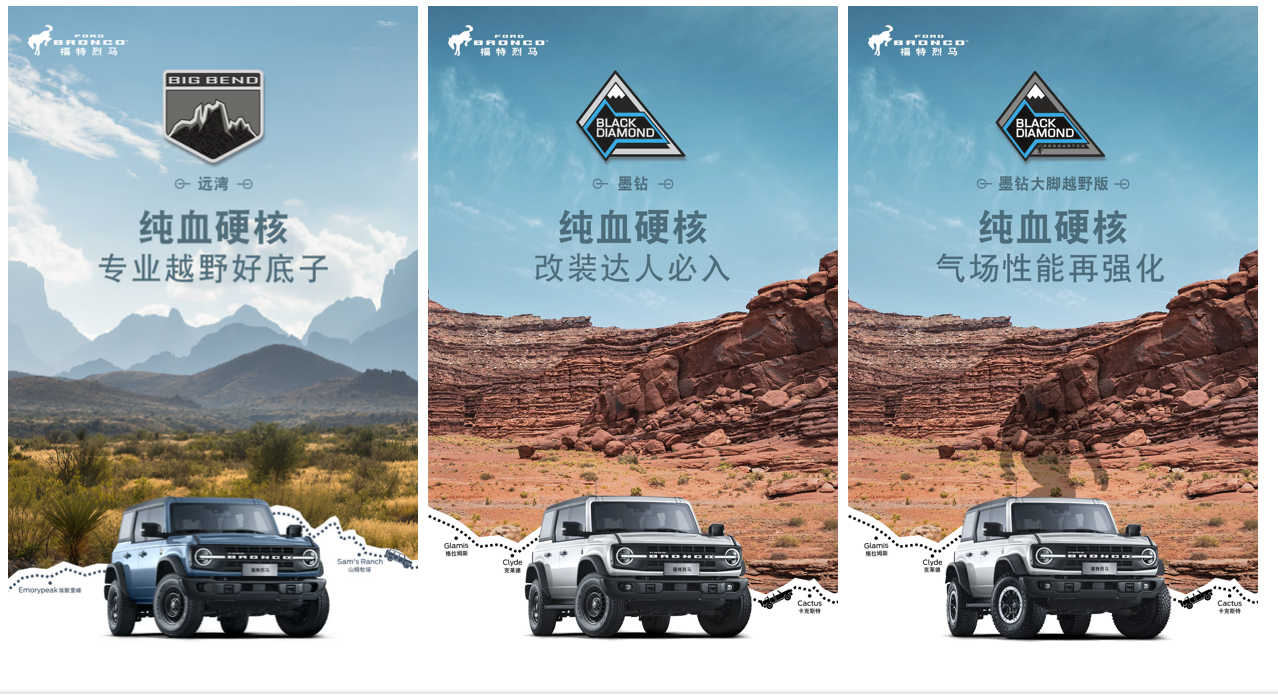 参考目前官网的信息,国产的福特烈马将推出7款车型,车型名称也与海外版相对应,像BIGBEND在海外也是最入门的车型。国内版本除了两款延伸的大脚包选配,和一款大满配的限定版外,可以看成是高中低四款不同的配置。