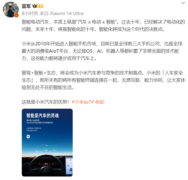 智能才是汽车的灵魂,小米作为一家科技企业、全球前三的智能手机公司,最强的优势是智能科技。