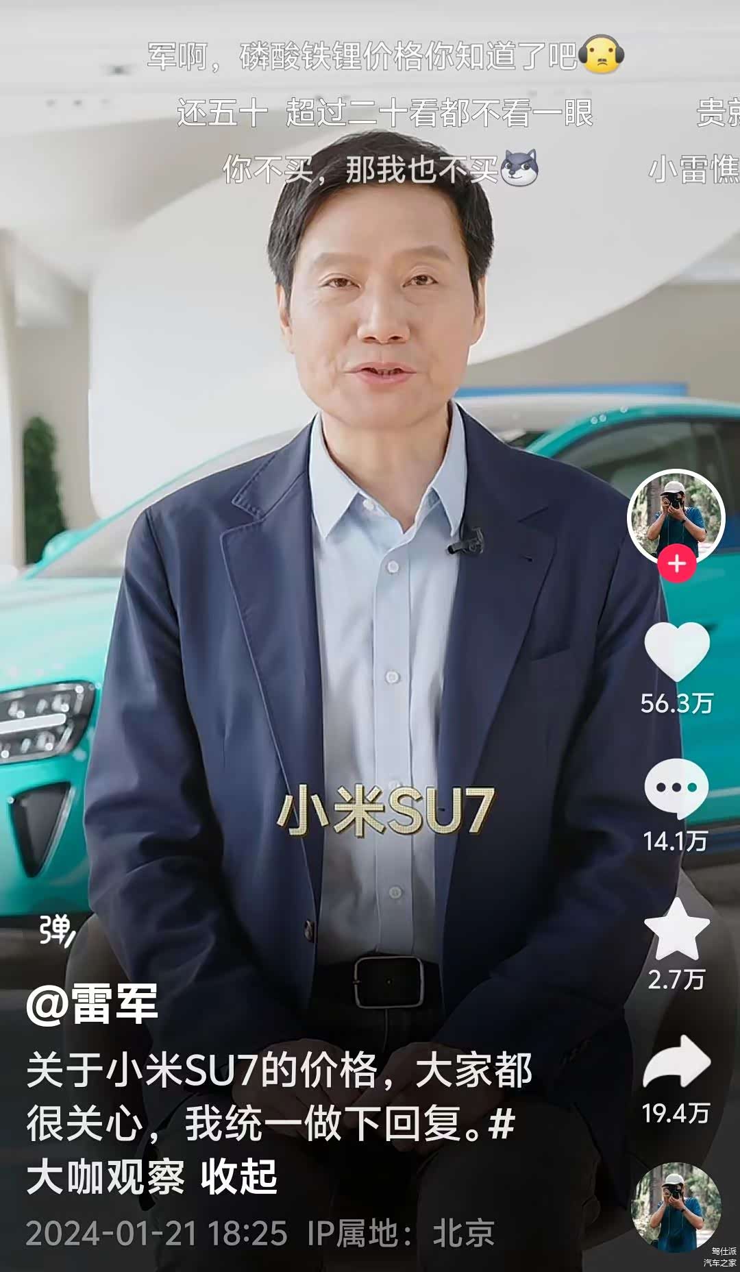 在雷军个人抖音号上,他自去年12月25日宣布“小米汽车技术发布会即将到来”的视频后,截至成稿,一共发布了32条视频,其中只有9条和汽车无关,其余23条与汽车有关的视频总点赞量达到340.8万,单条最高点赞量达到56.3万、评论14.1万、收藏2.7万、转发19.4万,内容是关于小米SU7价格的回复。