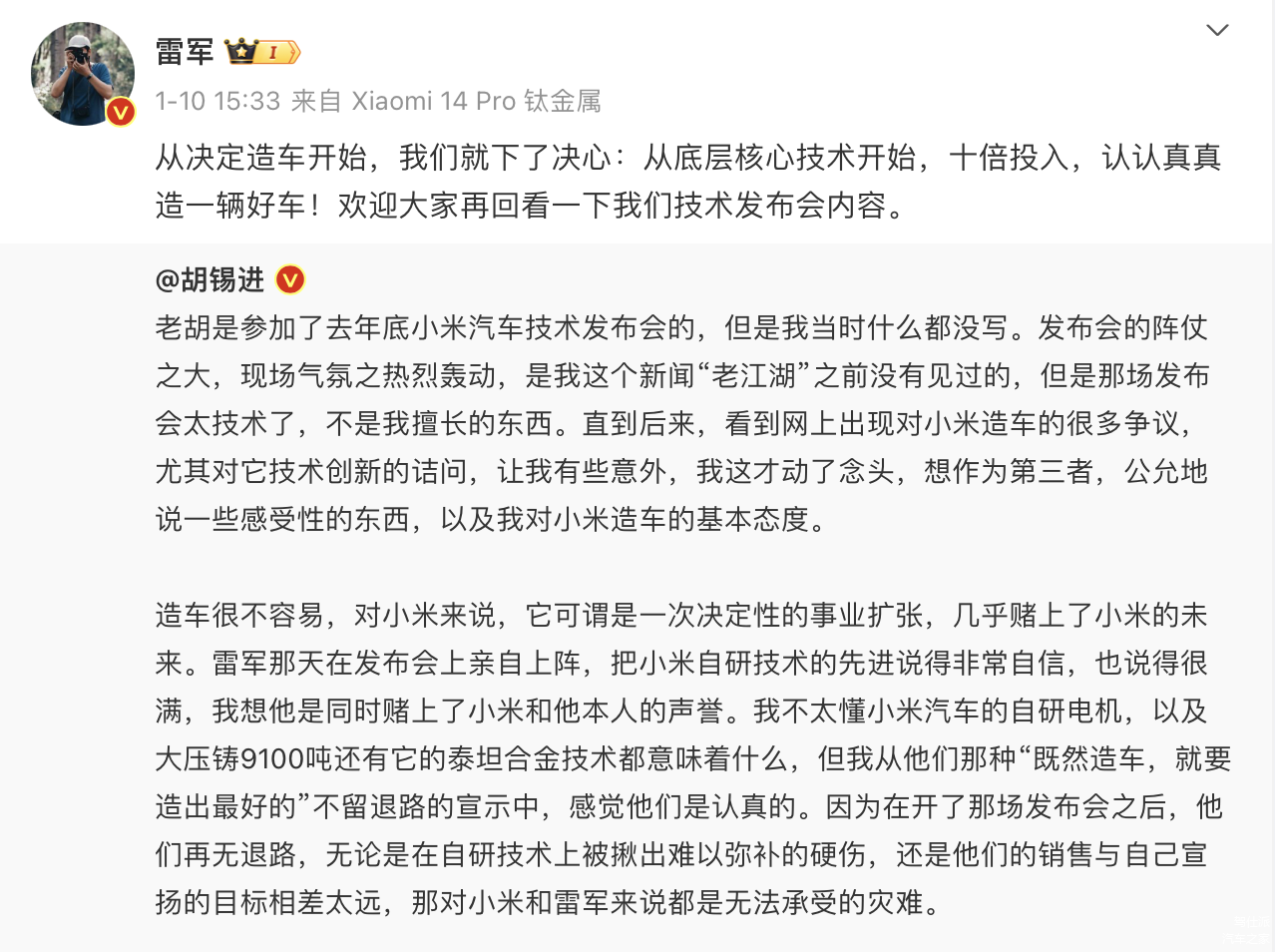“这是我人生最后一次创业,我愿意押上我全部的声誉,为小米汽车而战。”