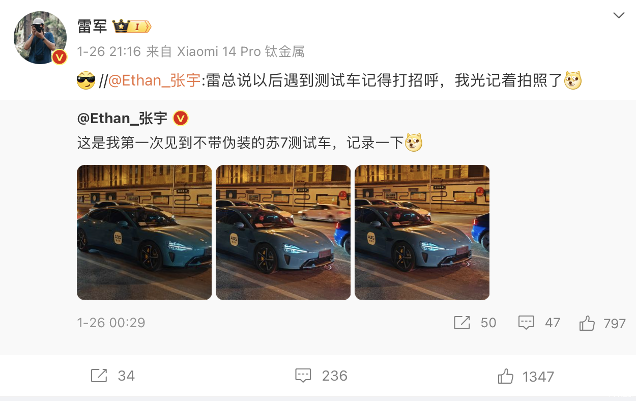 而更为重要的是,小米汽车还拥有其最大个人IP——雷军。自小米官宣造车以来,雷军就成为小米汽车的官方代言人和宣传大使,目前已经入驻微博、小红书、微信视频号、抖音等社交媒体平台,以其个人影响力带动小米SU7的讨论度。