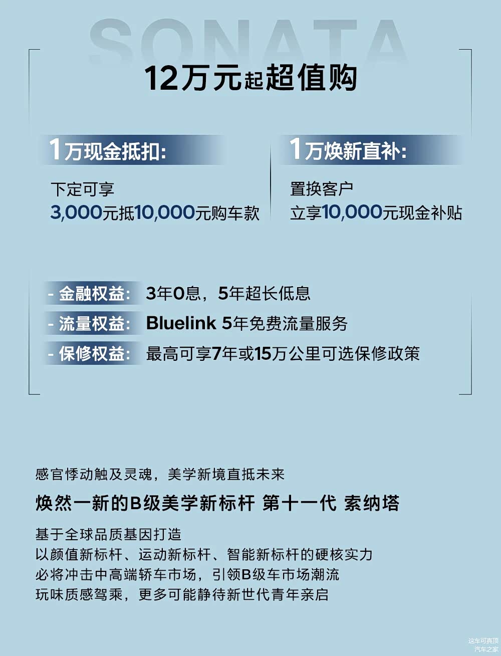 第11代 索纳塔(图片 | 参数 | 询价)正式上市,售价公布,1.5T版本是13.98万~16.28万,2.0T版本是16.38万~18.68万。哎?开头说的11.28万起是怎么回事,别急,新车上市推出了不少福利活动,第1个是交3000定金抵1万车款,这就相当于优惠了7000块钱。然后你只要置换,还给1万的置换补贴,那么13.98万的起售价就变成11.28万了。另外还有低息贷款、免费流量、超长质保等购车福利。