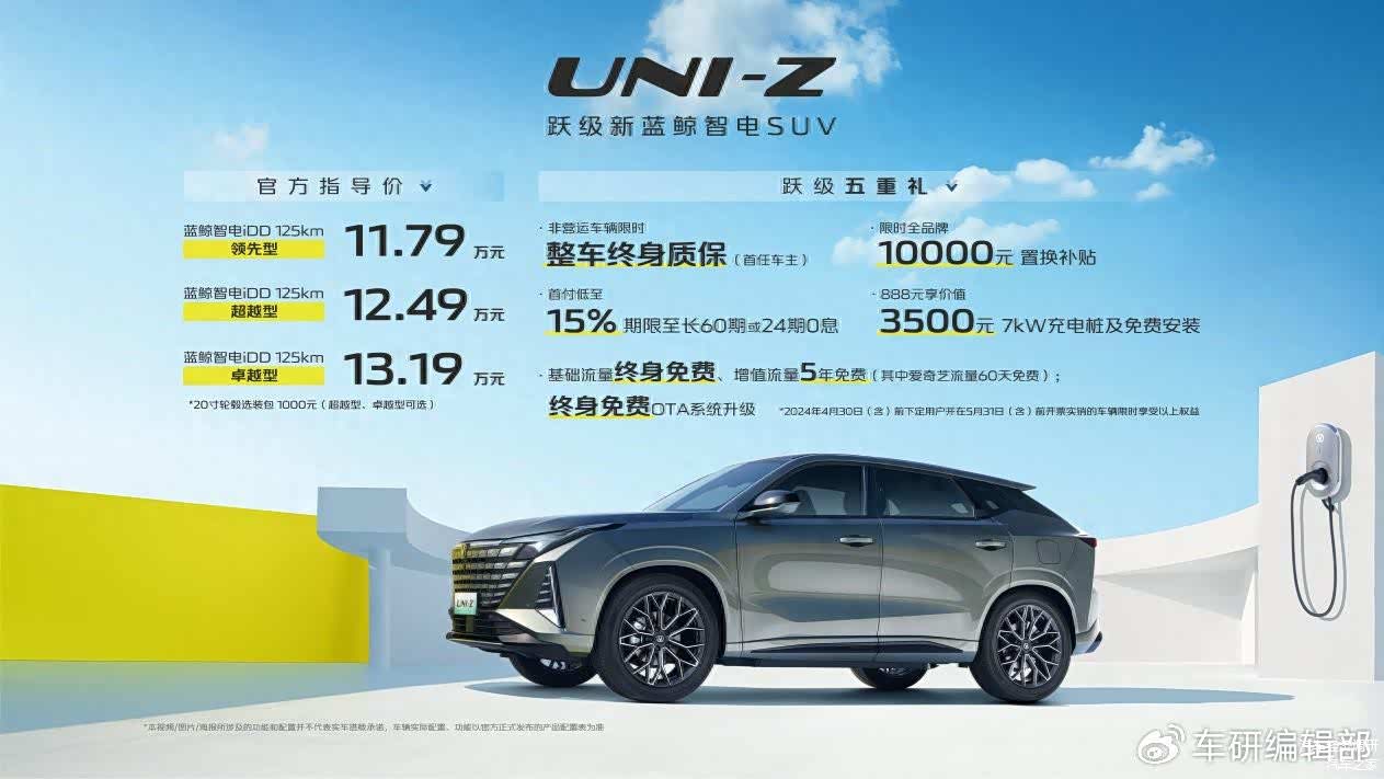 3月28日,长安UNI-Z上市直播发布会盛大举行。在全网见证下,跃级新蓝鲸智电SUV——长安UNI-Z正式上市,此次共发布3款配置,分别为蓝鲸智电iDD 125km领先型、蓝鲸智电iDD 125km超越型、蓝鲸智电iDD 125km卓越型,官方指导价11.79万元-13.19万元。