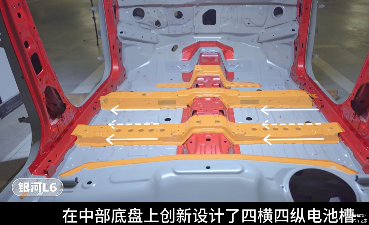 此外,银河L6还采用了一些特殊设计来保护油箱和电池。油箱被放置在后轴前方,并且整个底盘都有底护板加以保护。比秦plus那样将油箱放在后轴后方的设计,在追尾碰撞时,更能避免油箱也受到冲击。电池则采用独家设计的四横四纵电池槽包围式保护,还加入了防刮梁。银河L6的整个底盘,都有高强度钢底护板保护。为了进一步保护油箱和电池,银河L6添用于防腐防锈的PVC涂层,都要比秦plus的厚0.05mm。
