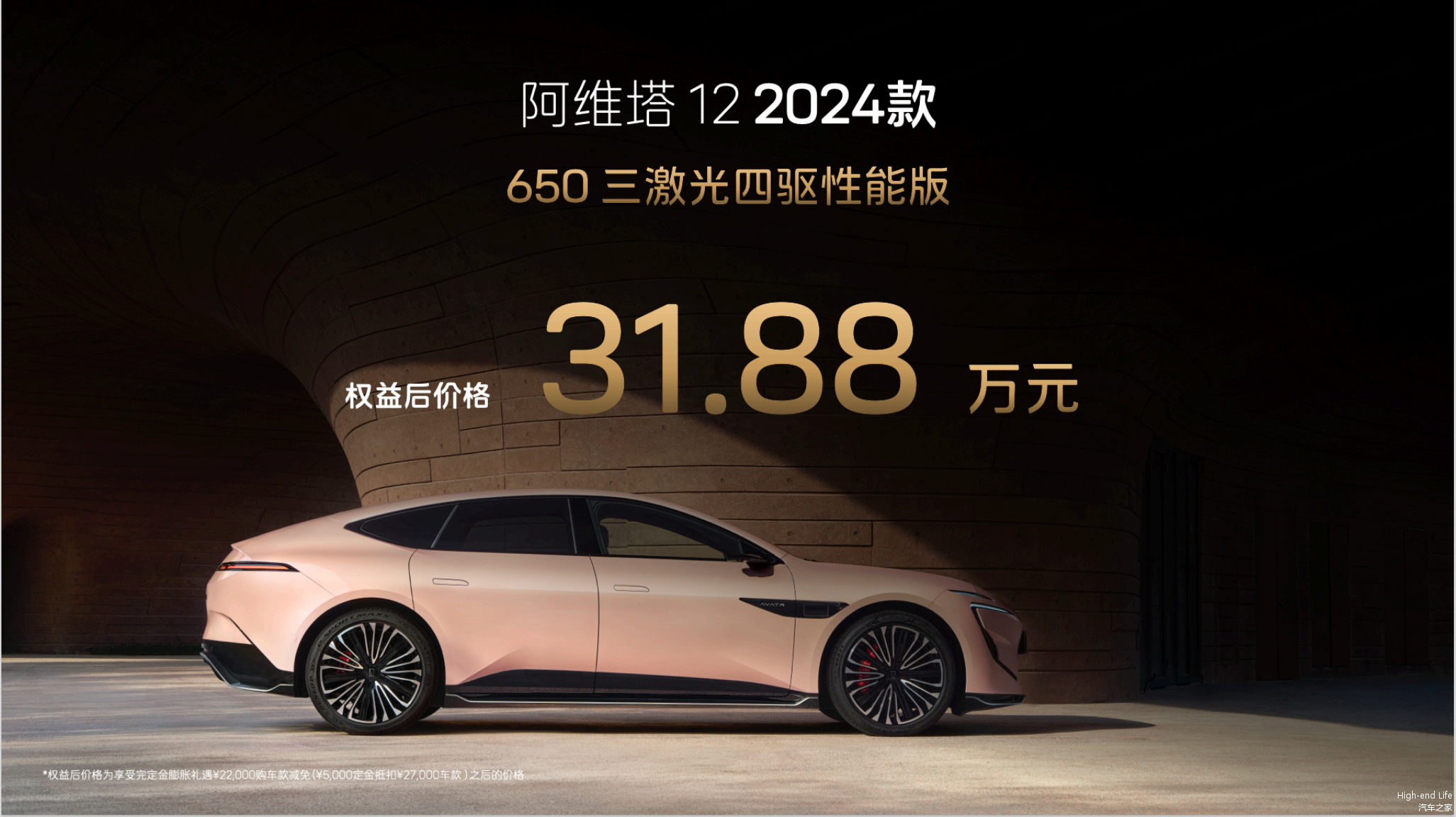 3月29日,2024款 阿维塔12(图片 | 参数 | 询价)上市。新车共推出4款车型,价格区间为26.58万元-40.08万元。并新推出 700三激光后驱智享版,标配华为ADS 2.0、800V高压超充等,同时还新增晖金车色。