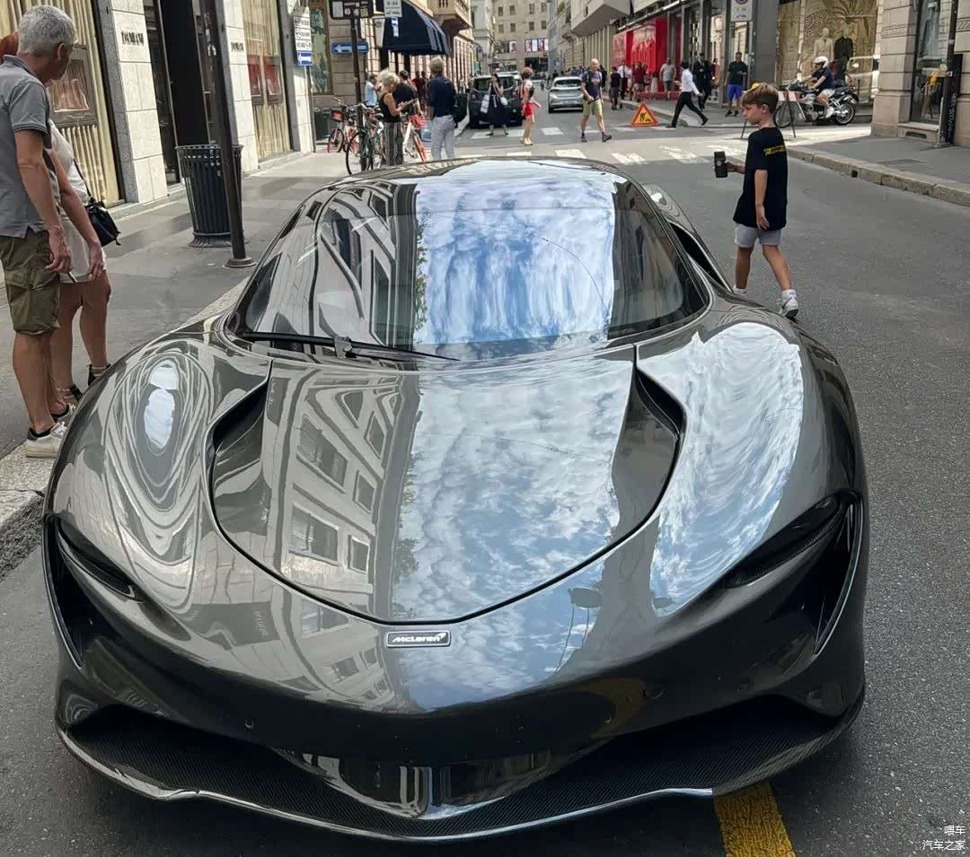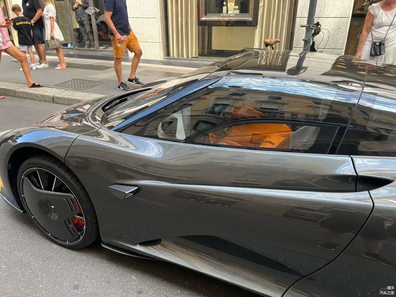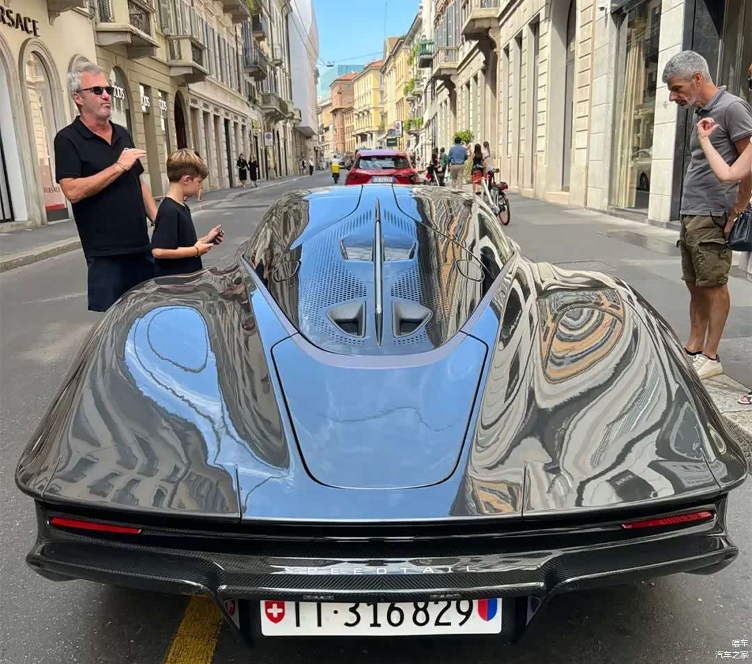 迈凯伦Speedtail,全球106台,175万英镑起(不含税),这台车也是张康阳的,开着它停在米兰街头,当地的人也是围观拍照。它吸引人的地方是有着长长的船尾式的后端,驾驶舱是泪滴状的,还有那不符合交规的伸缩式后视镜。每一台Speedtail都带编号,都有专属铭牌,这台是104号。