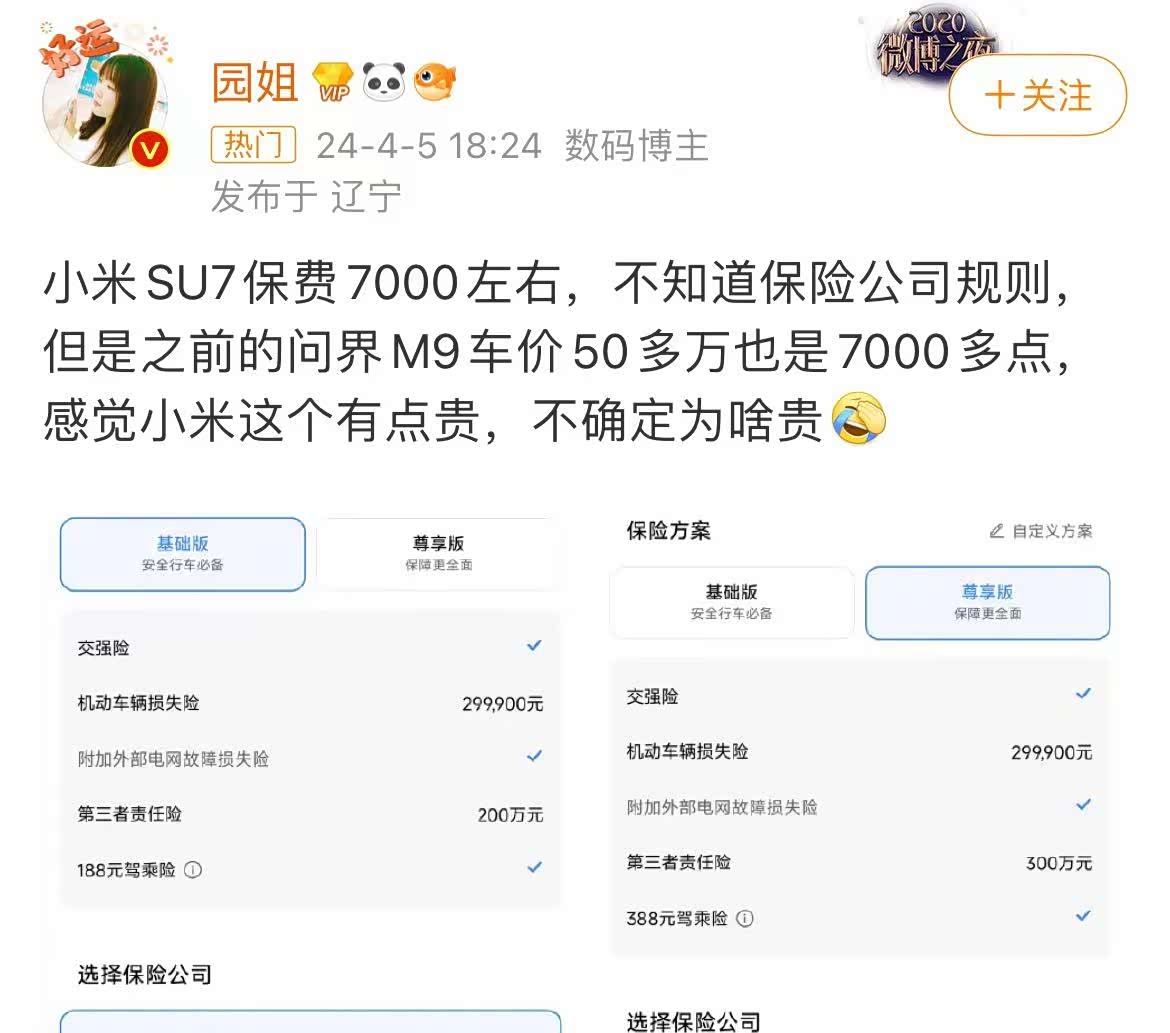 最近 小米SU7(图片 | 参数 | 询价)开始了大规模的交付,在交付时,避免不了的就是付车款和购买相对应的交强险和商业保险。有不少网友把办理保险页面的截图分享在网上,其中,售价29.99万元的小米SU7 Max版,保险的费用在7000元左右,被不少网友拿来和问界M9对比,并觉得小米SU7的保险价格较高。对比30万价位段的传统燃油车型,保险价格也偏高。