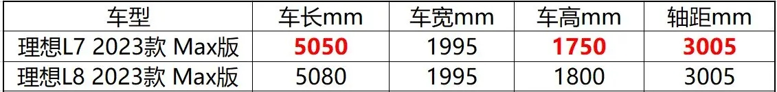 尺寸方面,理想L7、L8的车身尺寸如上表所示,可以看出L8在车长上高出L7 30mm,车高上高出50mm,其余均保持一致。