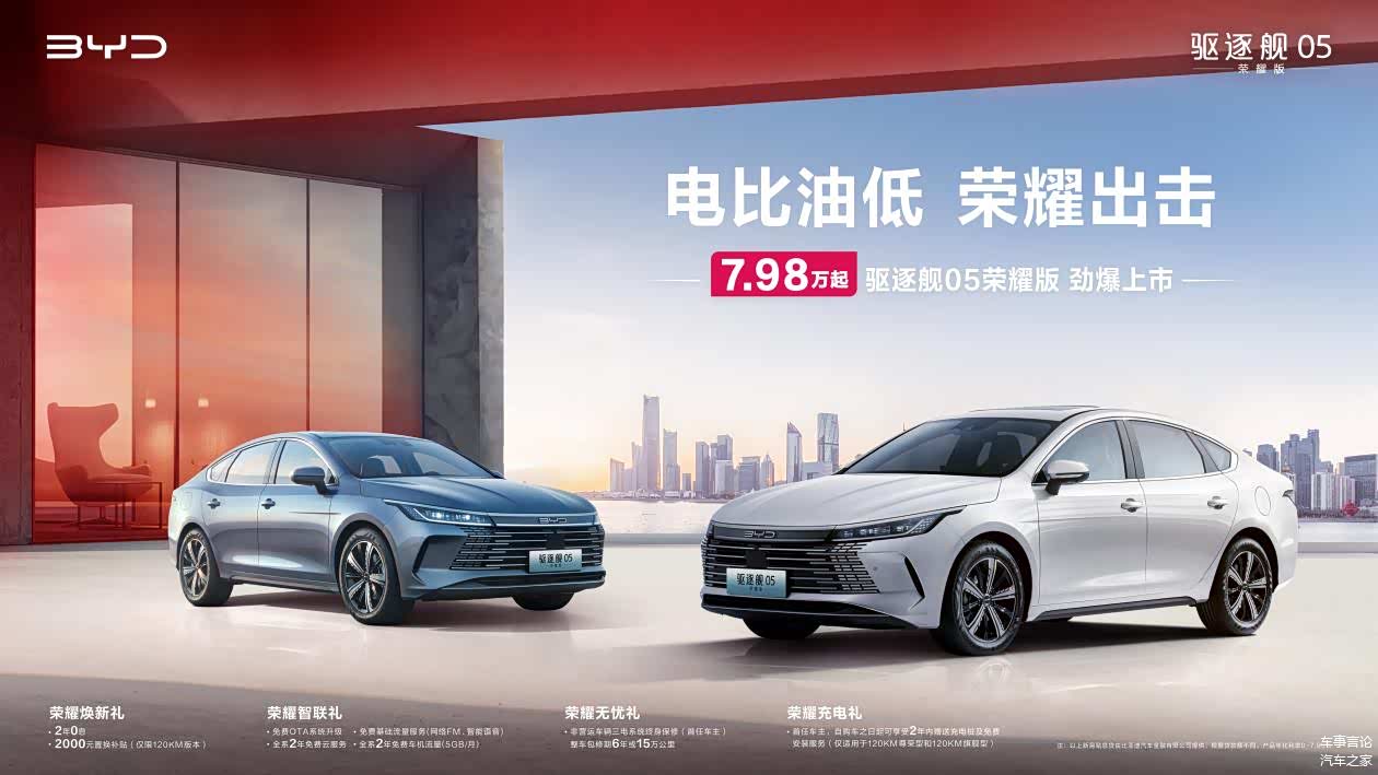 驱逐舰05荣耀版7.98万元起,携手兄弟车型秦PLUS,率先开启荣耀版上市的节奏。“电比油低”、免购置税和超高性价比,不仅大幅降低家用新能源车的门槛,更是刷新了消费者对家轿的价值认知。相比兄弟车型,不烂大街,更具年轻化的设计,家轿真香首选。