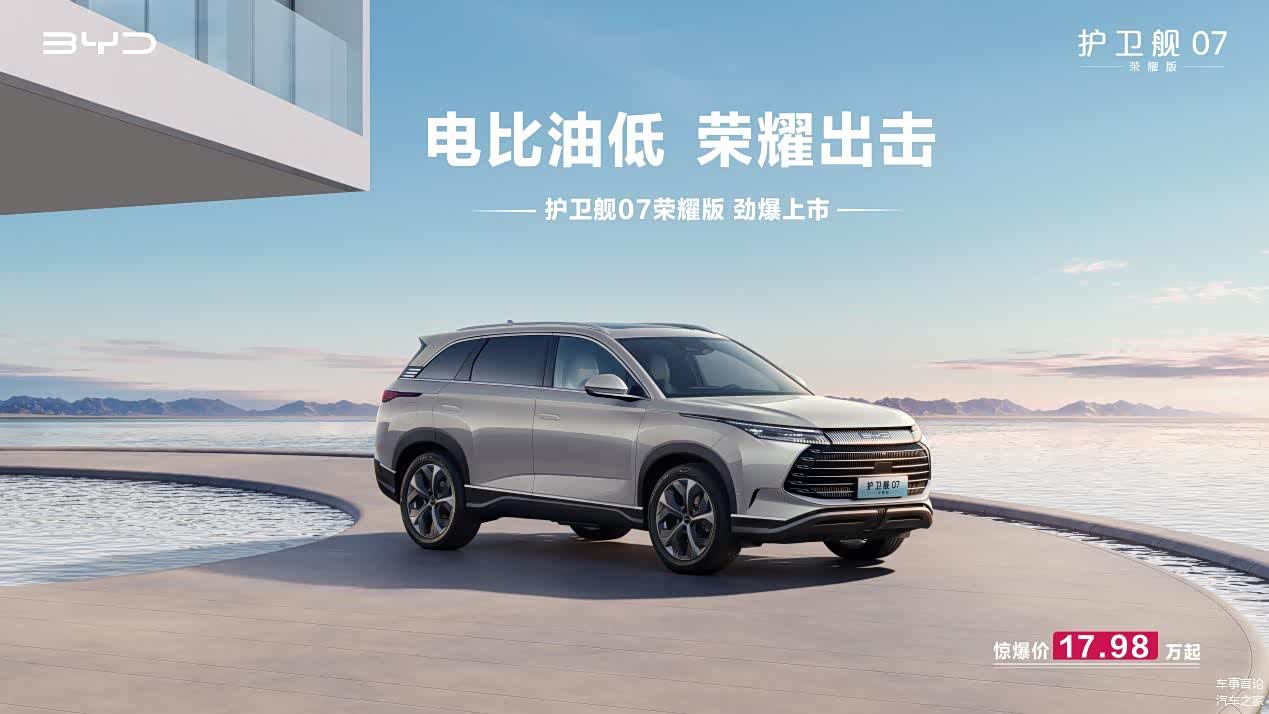 护卫舰07荣耀版17.98万元起售,新增贝壳白内饰,并标配6kW外放电、10.25英寸全液晶仪表、50W手机无线充电,车机升级为DiLink 100。