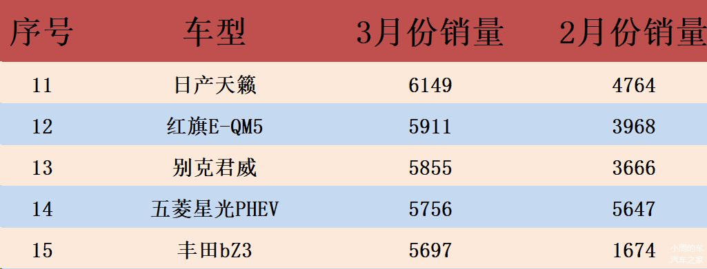 排名第十一至十五名的分别是日产天籁、红旗E-QM5、别克君威、五菱星光PHEV、以及丰田bZ3,它们在过去的一个月里分别卖出了6149辆、5911辆、5855辆、5756辆以及5697辆。