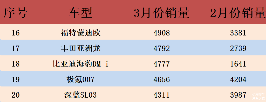 福特蒙迪欧、丰田亚洲龙、比亚迪海豹DM-i、极氪007以及深蓝SL03分列第十六至二十名,对应的销量分别是4908辆、4792辆、4777辆、4656辆和4311辆,环比分别增长了45%、75%、191%、11%和8%。