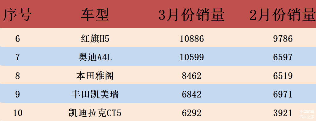 榜单前十名中还有红旗H5、奥迪A4L、本田雅阁、丰田凯美瑞和凯迪拉克CT5,对应的销量分别是10886辆、10599辆、8462辆、6842辆以及6292辆。