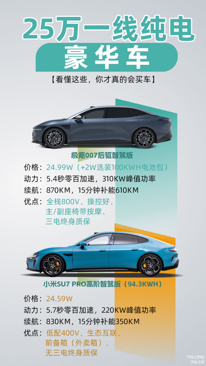 作为小米汽车的首款车型,SU7在研发之初就面临着诸多挑战。高昂的锂电价格、新能源市场的渗透率以及供应链的启动等问题都是需要克服的难题。尽管定价21.59万元起,但这仍然让不少消费者心动不已。然而,在相似的价位区间,极氪007后驱智驾版同样是一款不可忽视的竞争对手。特别是当极氪007后驱智驾版加上2万元升级100KWh麒麟电池后,与小米SU7 Pro的对比更加引人关注。