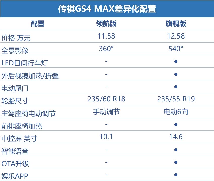 传祺GS4 MAX只有两款车型,配置差异比较一目了然。