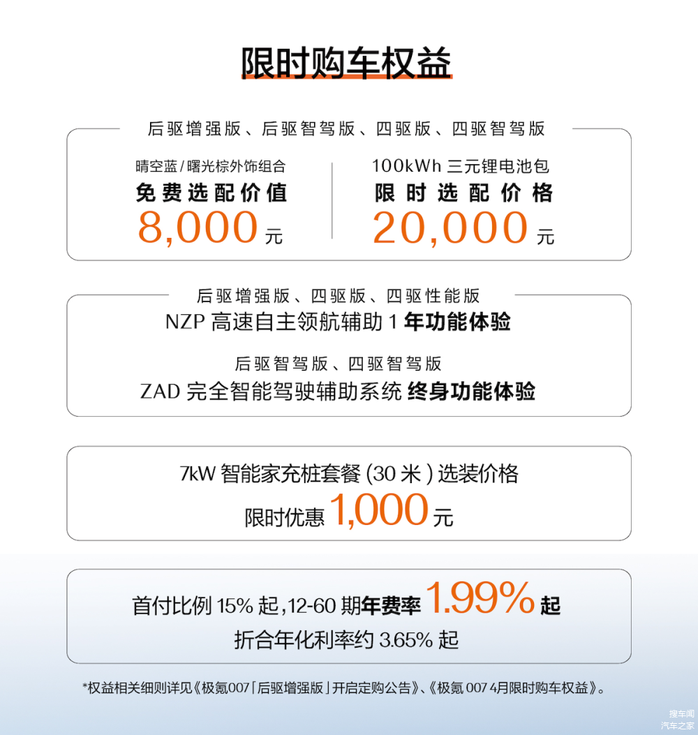 极氪现推出限时优惠,免费赠送价值8000元的晴空蓝/曙光棕外饰组合,同时100kWh三元锂电池包也有特惠价,限时优惠20000元。不容错过!