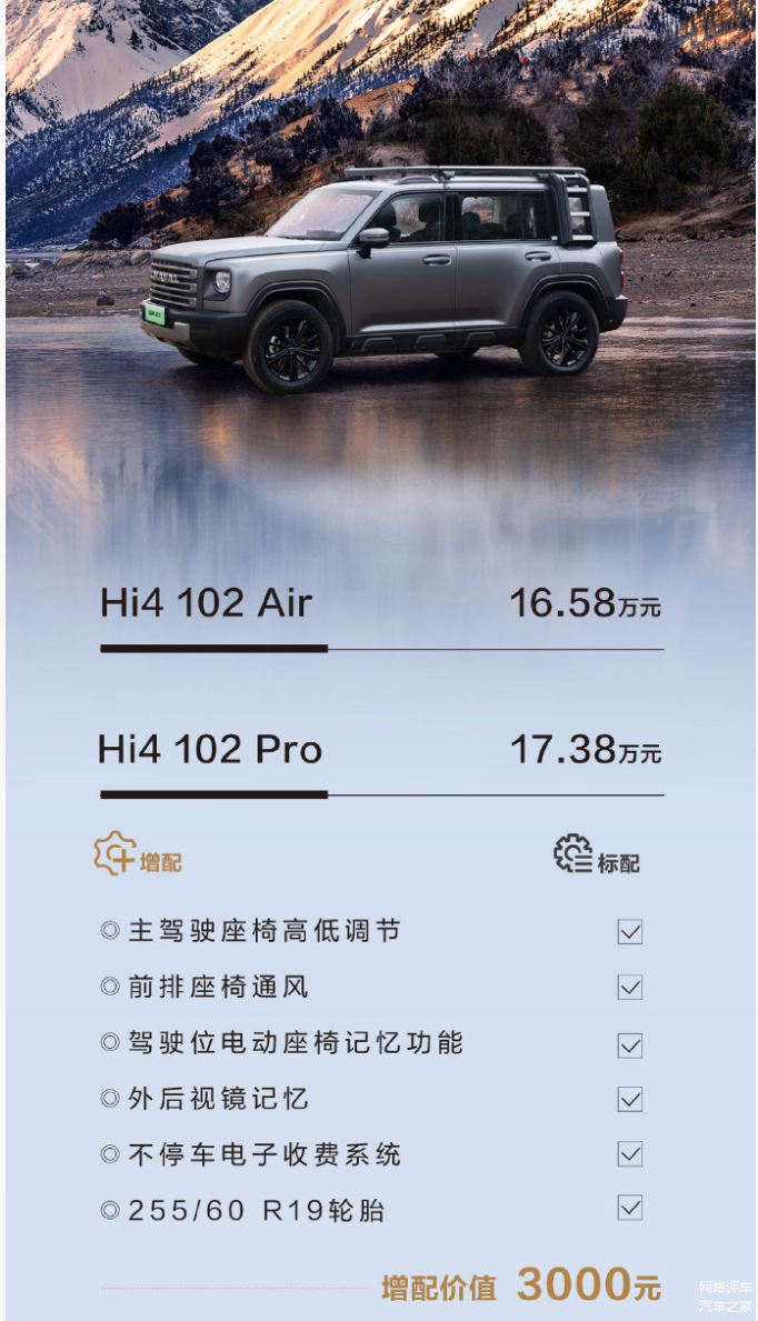看点2:整车高度提升21mm(通过性提升、坐姿变高)、升级了标配255/60 R19,还有265/60R18的选装(更容易装AT胎。)、车顶平台+侧爬梯也到位。