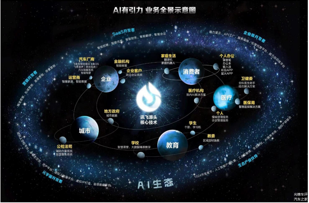 从2016年开始重押深度学习,科大讯飞一直很重视AI和应用的落地,也因此获得了5年业绩翻倍的成果。在大模型之前,科大讯飞的业绩陷入了增长的困境中,就在这个关键时刻,又抓住了大模型的救命稻草。“在保持单点核心技术的持续创新和领先基础上,持续拓展科技树的广度和深度”,科大讯飞曾如此阐述其做大模型的思路。上升到整个AI业务层面,科大讯飞早在2017年就制定了“平台+赛道”的战略。在大模型时代,该战略被重新赋予了内涵,“平台”即讯飞开放平台,为开发者提供AI能力及一站式人工智能解决方案,构建AI产业生态;“赛道”指AI在教育、医疗、智慧城市、 运营商、汽车、金融等重点赛道落地应用,并在AI 学习机、 智能办公本、智能录音笔、翻译机、智能助听器、讯飞听见等C端消费者产品上形成品牌优势和可持续流水型收入。