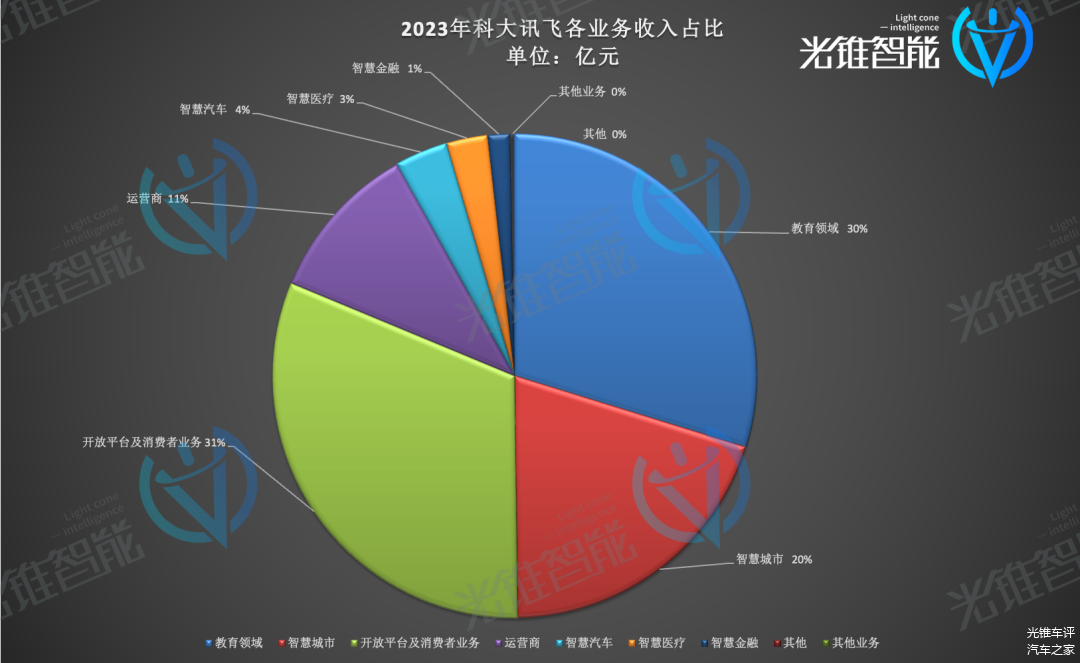 截至2023年底,科大讯飞搭建起了以大模型等核心技术为中心,城市+教育+医疗+消费者+企业的AI生态。从2017年至2022年,教育领域的业务一直是科大讯飞的第一大现金牛业务,2023年成为了关键的转折。从结果来看,2023年开放平台及消费者业务占营收收入比例略超过教育领域业务,成为了科大讯飞第一大业务,其次是智慧城市、运营商、智慧汽车、智慧医疗、智慧金融。